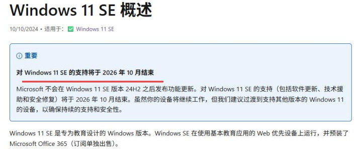 微软宣布2026年10月终止支持Windows 11 SE, 建议用户尽快迁移